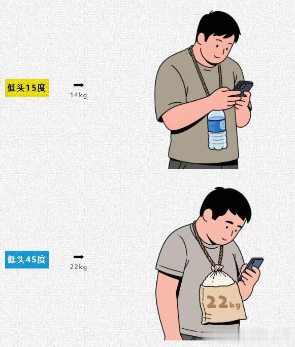 研究显示,低头15度时,颈椎承受的压力就有14kg,相当于脖子上挂了1桶矿泉水,如果低头角度增加到45度,颈椎的负重直接飙升到22kg,相当于1袋大米挂在胸前。同时,椎动脉扭曲引发脑供血不足,会有40%患者出现“刷机眩晕症”。
